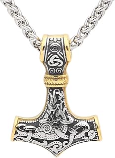 Herren Halskette Edelstahl Wikinger Thor Hammer Anhänger Mjölnir Kette Hammer Ketten-Anhänger mit 24" Kette Motorradfahrer Biker Rocker, Silber/Gold
