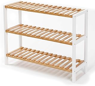 Edaygo Schuhregal Schuhschrank mit Sitzfläche Sitzbank, Schuhablage 3 Ebenen für 12 Paar Schuhe, 55 x 70 x 25 cm (H x B x T) Bambus und Holz, Weiß